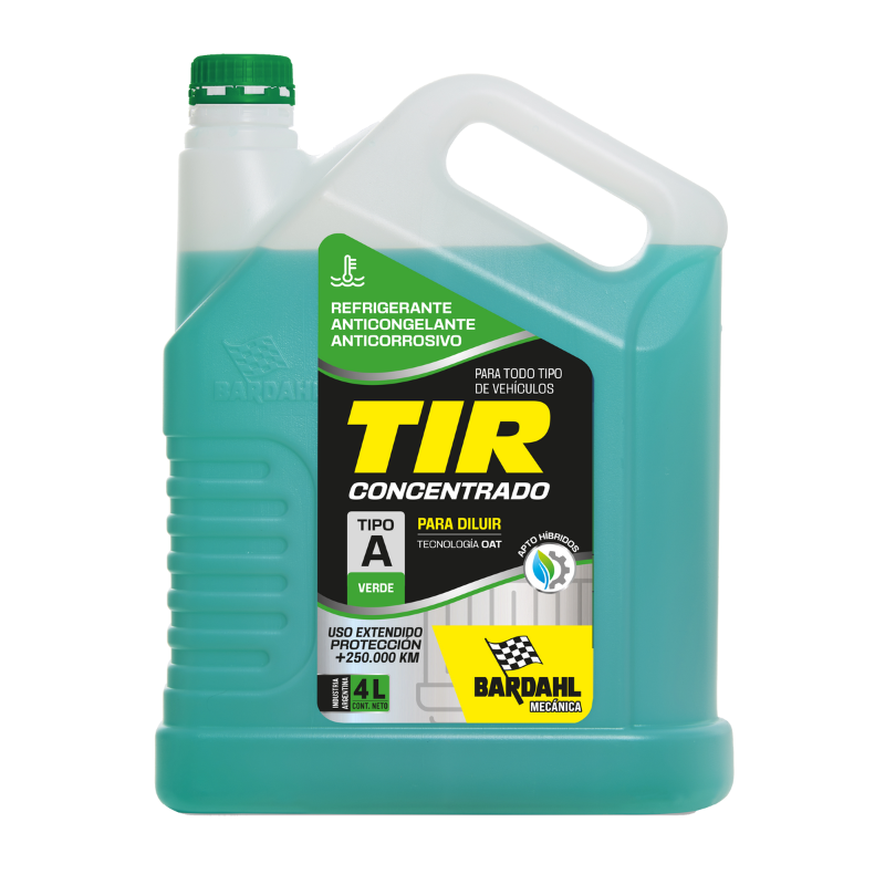 MODO DE USO: Si el radiador está limpio agregar TIR al 50% del volumen total del sistema de refrigeración, completar con agua destilada o desmineralizada. Si el sistema está sucio se debe limpiar previamente con Limpia Radiadores Rápido de Bardahl. No se recomienda mezclar con otros productos.
